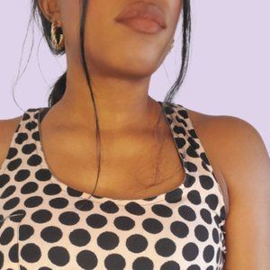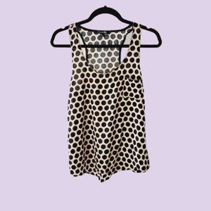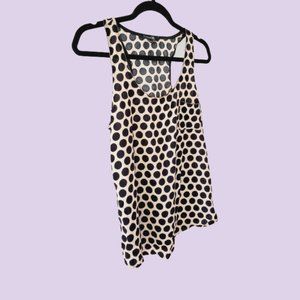 Looking for a dressy tank top? Well, this pink and black polka dot gently worn tank top with silver edged details is perfect to pair with jeans, or a black pleather skirt. Perfect to wear to a summer bbq event or a night out.