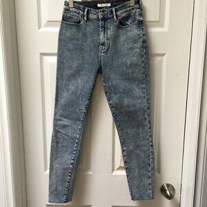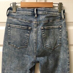 - These high-rise jeans come in a blue acid wash and feature a raw cut hem