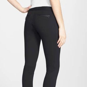 Smooth, skinny pants boast leather trim at the pockets for a modern touch in the classic day-to-dinner style. Ankle length, size 26. Excellent condition