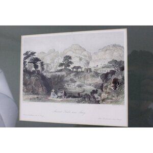 Two fine antique engravings by Thomas Allom, both are handcoloured Victorian prints made from steel engravings excised from Allom’s monumental work on China in the 1840’s. The first being of the Ancient Tombs near Amoy, drawn by Thomas Allom, engraved by W. le Petit. Sketched on the spot by Captain Stoddart, R.N. (Royal Navy). The second is of Lake See-Hoo and Temple of the Thundering Winds, from the Vale of Tombs, drawn by Thomas Allom, engraved by J. C. Bentley. They were sketched in China during the British occupation and Opium Wars. Beautifully framed in simple wooden frames with a forest green mat.