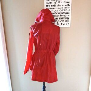 This is a perfect rain coat for home or for travel. The inside has a drawstring for a more snug fit, if desired. It has a removeable zip-off hood that has a reflective strip of fabric for night walking safety. There are 2 deep front pockets. Both sides at the hem have zippers. The front has a zipper that will open from the bottom up or the top down with snap closure as well. Please note the last picture shows one of the snaps has come loose from one side. It is the top piece of the snap. It is still connected to the opposite side. It can easily be reattched. Price will reflect this minor flaw. Otherwise, this rain coat is in perfect condition.