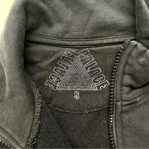 Chic zip-up sweater by PALACE. Features black top and gray bottom. Stylish and versatile. Stain on sleeve - in photo.