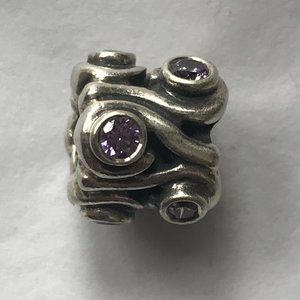 RETIRED - Pandora silver and light purple zirconia Ocean Wave charm, .925 sterling silver. The swell of the waves is created in linking silver swirls, at the centre of the fluid shapes, light purple zirconia stones sit.