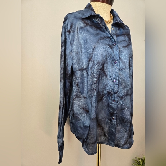 Blue and black marbled lightweight shirt. Long-sleeved and a full pearly purple snap button down closure.