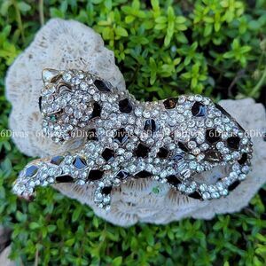 Silver tone gorgeous panther Brooch, with green rhinestones eyes