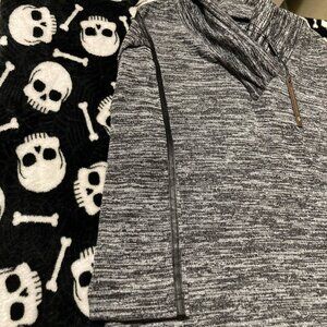 Highlights include chic little strips of faux leather on the shoulders and sleeves, the awesome cowl-meets-turtleneck (neckline), the longer (tunic-y) length of this garment, and the fabulous heathered blend of light and charcoal grey. ๐ฉถ๐