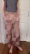 Wide elastic (not very stretchy) waist band with pull up string. Material is soft satin jacquard, flowy, has cool silk-like feeling against the skin but with more weight to it. Color is hard to describe- something between rose gold, beige, mauve and lilac, with beautiful textural sheen.