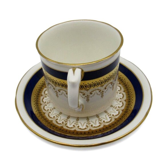 This elegant Paragon demitasse cup and saucer set showcases the intricate Stirling pattern with a regal combination of navy, gold, and white hues.
