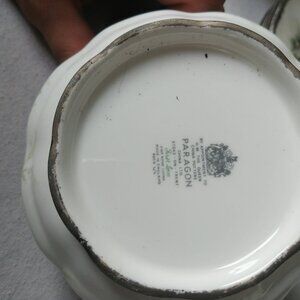 This charming sugar bowl by PARAGON made in england rare piece showcases a round bulbous body topped with a domed lid, perfect for serving sugar or small treats. The elegant white and cream color is beautifully complemented by a delicate floral pattern and a refined metallic trim, making it an ideal addition to your dining collection.
