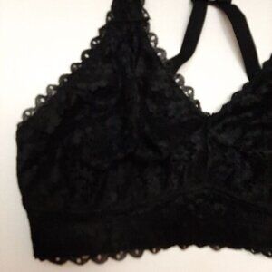 • Wire free, mesh lined lace cups long-line bralette in black with convertible straps to racerback with j-hook.