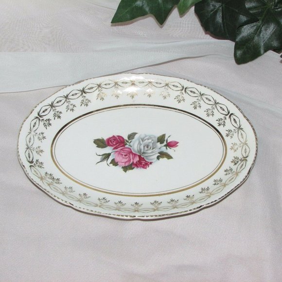Lovely oval dish with large pink and white roses, gold trim. Perfect for a tea party, use for sweets, relishes, pickles...