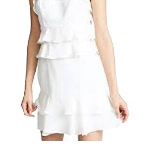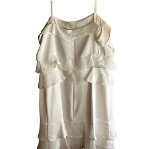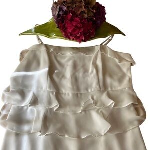 Self & Lining: 100% poly.Contrast: 100% silk. Dry clean only. Fully lined. Tiered ruffle overlay. Adjustable shoulder straps. Hidden back zipper closure. See measurements.