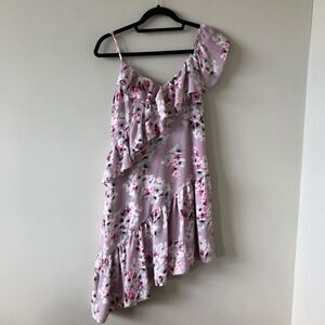 Ruffles decorate this patterned dress that features an asymmetrical hem and a cap sleeve. Fit: this style fits true to size. - V-neck - One cap sleeve - Hidden back zip closure - Ruffle detail - Allover print - Lined - Approx. 33" shortest length, 39" longest length (size S) - Imported
