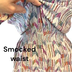 Cool and casual but a cut above the rest, this Parker 100% silk dress will make a great addition to your summer wardrobe. Short sleeves can be worn down or tied up for different looks. The smocked waist and smocking on the shoulder is a lovely detail. V-neck with strings that can be tied or loose. Hits at about mid-thigh (on a 5.5 model). Silk is light grey with an abstract chevron pattern in blue, red and violet.