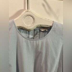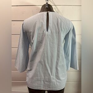 Blouse rayée bleu ciel et blanc signée Part Two. Manches 3/4, encolure ronde et joli nœud à l’avant pour une silhouette structurée et féminine. Fermeture au dos par bouton. Taille 36 indiquée. Parfaite pour les journées ensoleillées, à porter au travail ou le week-end.