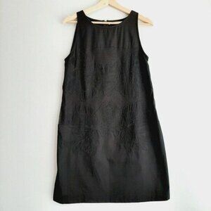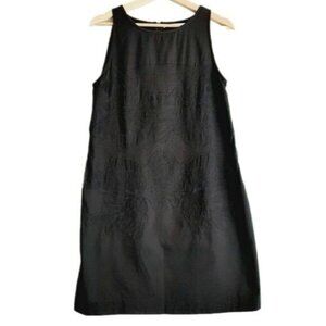 • Sleeveless crew neck dress in black with front flower applique and mesh design. A-line style with back zip closure.