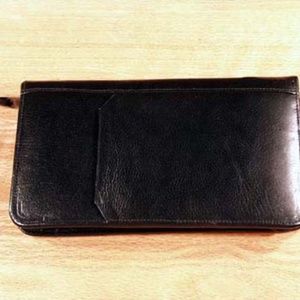 PASSPORT CASE, 6 POCKETS & 12 CREDIT CARD SLOTS, CALF LEATHER, BLACK, ZIPS ALL AROUND, 8 x 5 INCHES CLOSED, SATIN & LEATHER LINING, MADE IN CANADA, TOP QUALITY, NO DAMAGE, NEVER USED