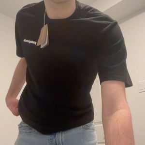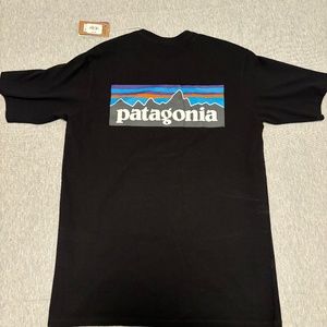 black patagonia tee in size small with logo embroidered on the back.