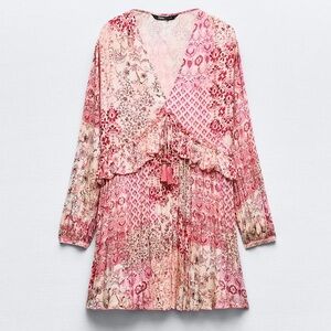 V-neck dress with long sleeves. Ruffle detail and front bow with tassels!