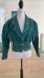 Patricia Wolf Made in Texas suede cropped length teal colour jacket. Fringe down the front, over the shoulder and down the back. Pleats on front and back. V shaped slit at back centre. Silver tone single button closure. Handpainted design on the back depicts an Indigenous rider on a horse. Painted design around collar and down lapels. Very big shoulder pads for an 80's look.