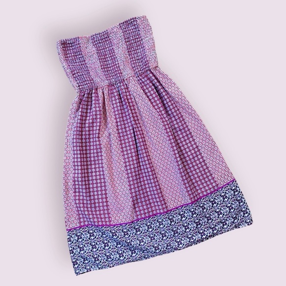 Super simple lightweight tube top dress. Sizing is European so I’m listing as a small based on fit on me. Elastic upper body. Purples and pinks can be pulled from the patterning.