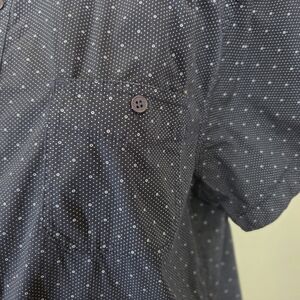 Stylish navy button-up shirt with white polka dots. Perfect for casual or formal occasions. Length 30" Width 23" Sleeves 9"