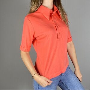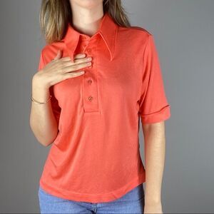 Vintage 1970s peachy orange T-shirt half button down dagger collar shirt. Shimmer to fabric. Unisex.