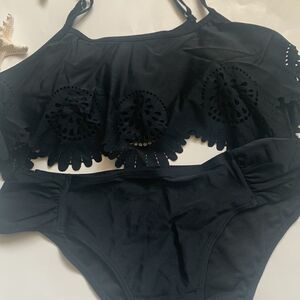 Bandeau ruffle top with straps, padded, high waist bottom. Nylon/spandex. Brand new.