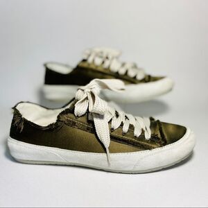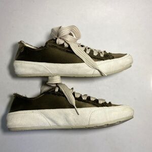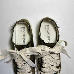 Pedro Garcia designer sneakers in forrest green. Wide shoelace strings and intentionally frayed edges. Suede rim on the side. Really great shape very light dirt/ dust on suede in areas. Refer to photos.