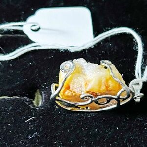 PENDANT, GENUINE AGATE GEODE, 3-DIMENSIONAL, LIGHT ORANGE/YELLOW WITH SILVER-TONE FILIGREE BACK AND EYE FOR CHAIN, TAG ON