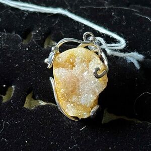 PENDANT, GENUINE AGATE GEODE, 3-DIMENSIONAL, LIGHT ORANGE/YELLOW WITH SILVER-TON