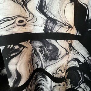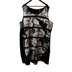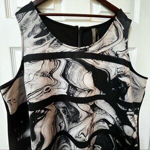 Pre owned. Size & fabric tag washed out. But dress is in great condition. No flaws. No stains. No damage. Back zip. Scoop neck. Marble like design in front. Polyester & spandex.