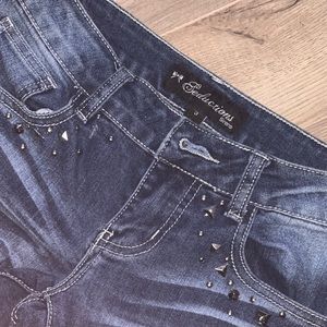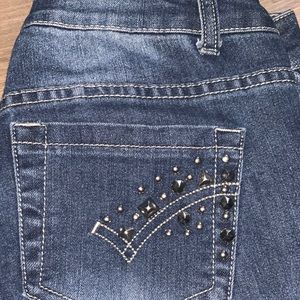 In love with these jeans! But sadly they don’t fit. Super cute and stylish. Can make a casual outfit stand out. Pockets in front and back. Comes with Distress rips and glittery patch work diamonds.