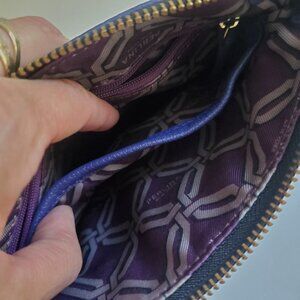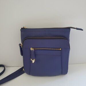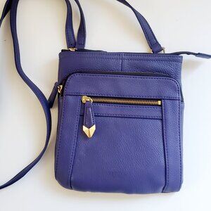 This is a great practical all leather crossbody in a striking shade of violet purple, with gold tone accents and a luxe interior fabric lining.