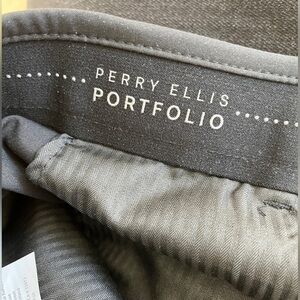 Perry Ellis Portfolio dress pants are made of a lightweight material (100% polyester). Machine wash cold, tumble dry low.