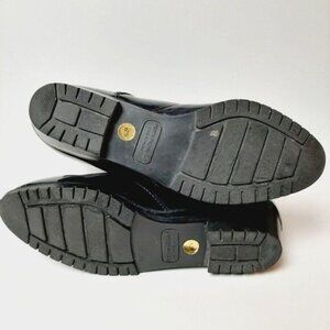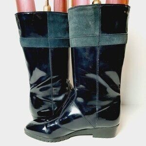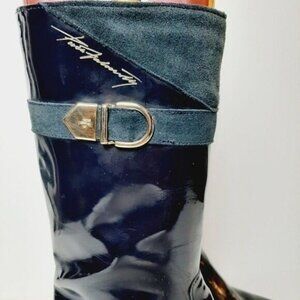 • Vintage navy rain boots with teal suede and metal gold tone details.