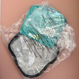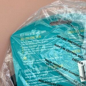 Messy Mutts pet grooming glove in teal and black. Ideal for grooming and bathing pets.