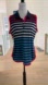 PGA Tour sleeveless striped polo top. White, red and blue stripes on a navy blue background on the front. Red trim down the sides. Solid navy blue back and collar. Branded buttons.