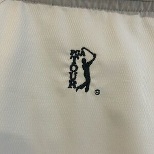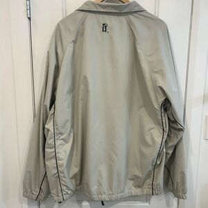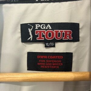 Lightweight PGA Tour windbreaker, designed for golf enthusiasts. Wind and water resistant fabric offers protection on the course. Features a full-zip front. Stylish and functional, with a subtle logo detail.