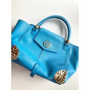 PHILIPP PLEIN Jenna Large Basics Shell Bag Studded Blue Leather Tote Bag Purse