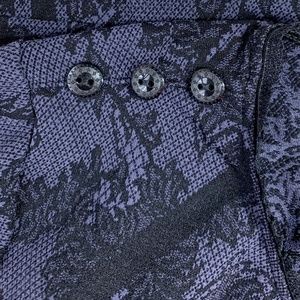 This Philippe Matignon black and lavender top features a feminine lace print and decorative buttons.