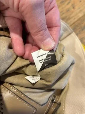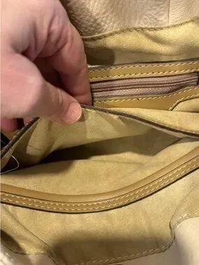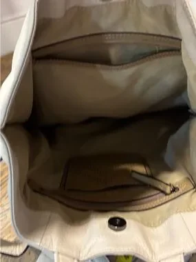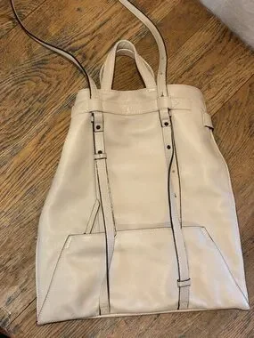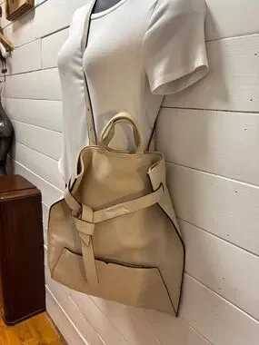 Minimalist and structured convertible backpack in a soft beige tone. PHILO model with a versatile design that can be worn as a backpack or carried by hand. Features a clean silhouette with signature front knot detail and practical interior compartments for everyday use. Remains in excellent condition overall, with minor visible wear on one strap. Original retail value approx. $360+tax.