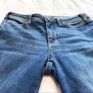 ANTHROPOLOGIE PILCRO AND THE LETTERPRESS HIGH RISE SKINNY ANKLE ZIPPERS DENIM JEANS, A fitted, stretch and comfy high rise / hig waisted medium wash denim jeans with a high rise (actually mid with 9" front rise) skinny leg with ankle zips - ankle length / cropped - zipper fly with one marled plastic button which is an alternative to the usual classic metallic button - 5 pockets styling - belt loops - not distressed / destroyed /ripped. Casual.