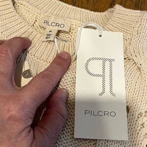 Cozy meets chic with this NWT Pilcro sweater from Anthropologie. A cable-knit textured top in soft cream is layered over a crisp white shirt base for an effortless pre-styled look. Perfect with jeans or trousers for a stylish, put-together outfit with zero effort. Size M.