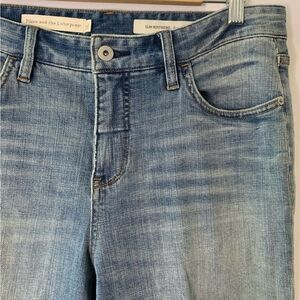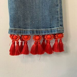 Light blue jeans with a vibrant red tassel hem. Perfect for a trendy look. Intentionally distressed look. Excellent condition.