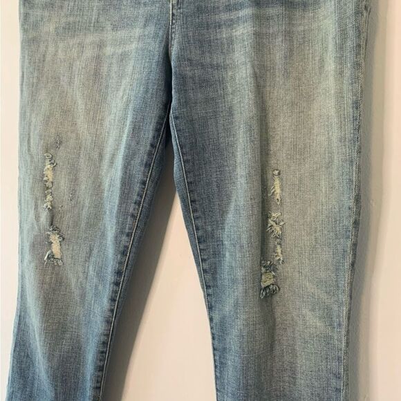 Light blue jeans with a vibrant red tassel hem. Perfect for a trendy look. Intentionally distressed look. Excellent condition.