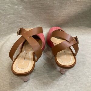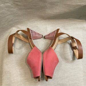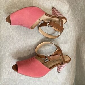 PILCRO & THE LETTERPRESS Sz 8 Anthropologie Suede Cap Lucite Stripe Heel Sandals. Super fun pair of heeled sandals in beautiful coral and tan ankle strap. Lucite style transparent stripped heel. Super comfortable and trendy. Dance the night away at a party, wedding, event, date night or just because. Modern yet classic. EUC.