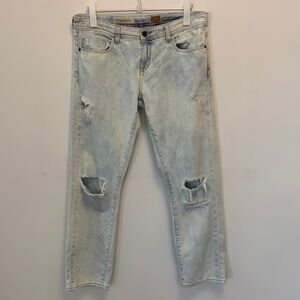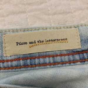 PILCRO and the LETTERPRESS ANTHROPOLOGIE Fit Hyphen jeans distressed light wash size 29. Relaxed fit, wear long or roll up to crop. A couple of faint marks- shown in pics and reflected in price