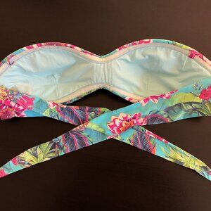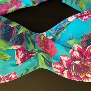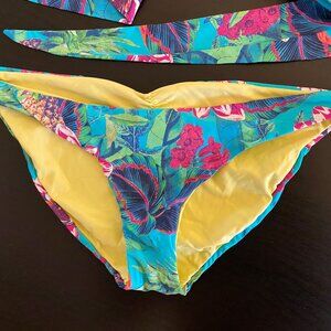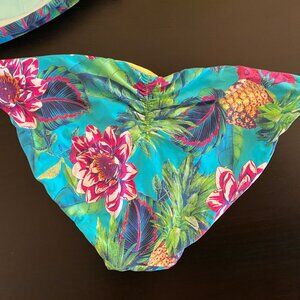 PILYQ tie-back tropical two-piece bikini with a bright floral & pineapple pattern. Yellow inside lining and rear ruching on the bikini bottoms.