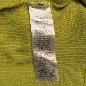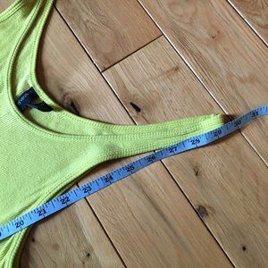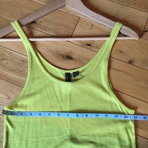 Very good preowned condition, ribbed, acid yellow tank top by Cynthia Rowley. Some outlets describe the colour as lime. Long, lightweight, comfortable and bold coloured, this garment is a perfect addition to a summer wardrobe.